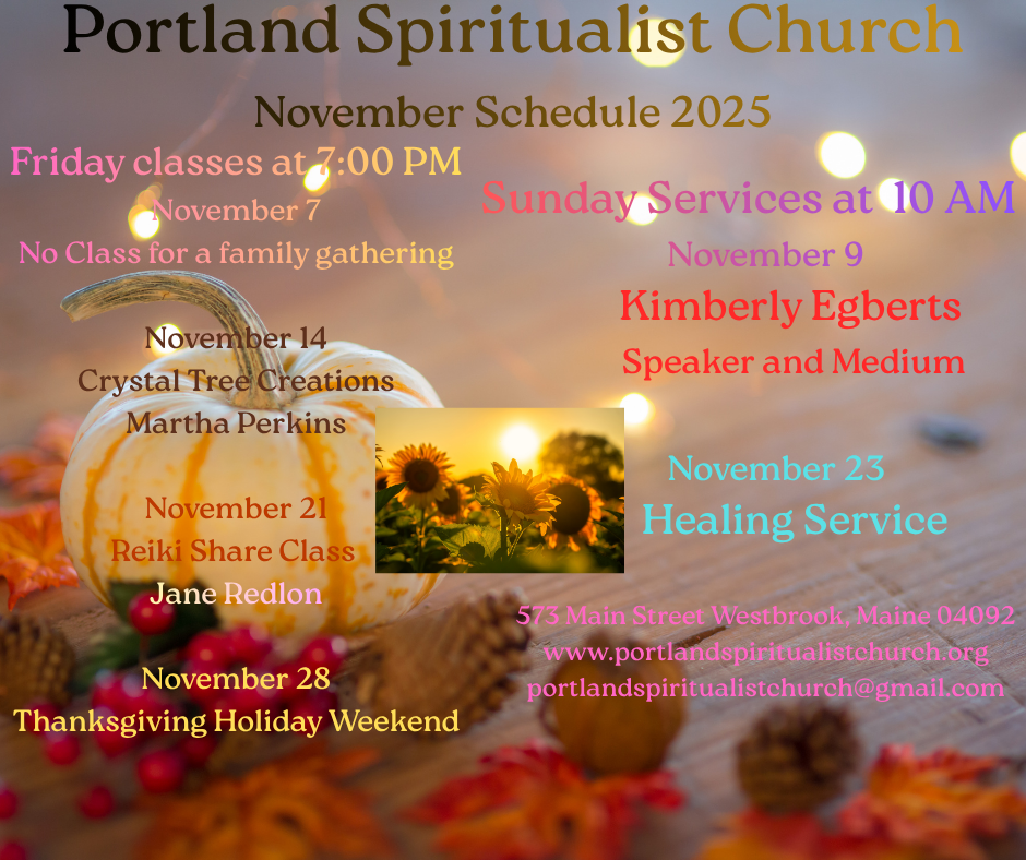 We are an ongoing work in progress as this post goes up. If anyone has an offering for a class for November 7th please reach out to us @portlandspiritualistchurch@gmail.com. We will be taking the Friday after Thanksgiving off and look forward to seeing you in December! Thanking you in advance for your thought and kindness!